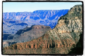 大太陽加上接近攝氏0度的氣溫,產生了暖色近景與冷色遠景的雙色大峽谷奇景…