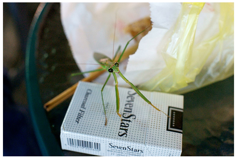 我還蠻喜歡螳螂的,小時候抓螳螂的時候,螳螂還很勇敢的咬我的指頭,這隻螳螂不負昆蟲殺手的美名,對我們兩個大型人類也是毫無畏懼,在我們桌上巡弋良久後,竟然朝我鏡頭爬上來,蹲踞在我的相機上,癱瘓了我的拍攝…