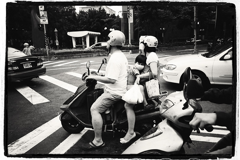 台北街景時常看的到這種親子夾心三明治,這組是火腿口味的~~ 其實,摩托車這樣共乘頗為危險,一個小差池就可能會大傷害…還是奉勸騎士爹娘們千萬別這麼做!!